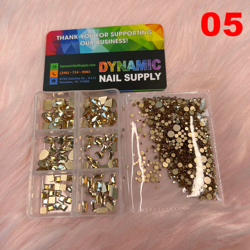 The Rhinestone Set by Dynamic Nail Supply is perfect for adding brilliance to your nail designs. It includes 6 big shapes with 20 pieces per shape and around 1,400 round rhinestones in various sizes.